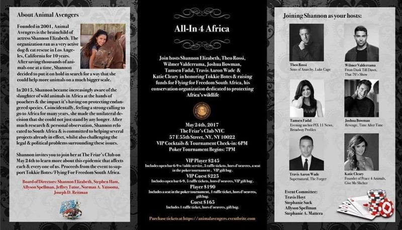 On Wednesday, May 24th, Actress Shannon Elizabeth and her non-profit organization, Animal Avengers, hosted All-In 4 Africa, a charity poker tournament, at the Friars Club in NYC. The evening’s celebrity hosts included; Theo Rossi, Wilmer Valderrama, Tamsen Fadal, Joshua Bowman, Travis Aaron Wade, and Katie Cleary. Proceeds from the event supported Tokkie Botes’ Flying for Freedom South Africa, a conservation organization dedicated to protecting Africa’s wildlife.